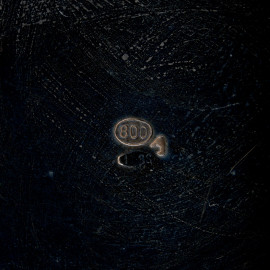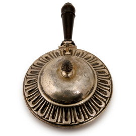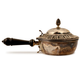 Tegame in argento con coperchio cesellato e sbalzato e manico a foggia di pigna, XX secolo, cm 11x26,5x14,5, peso lordo 320