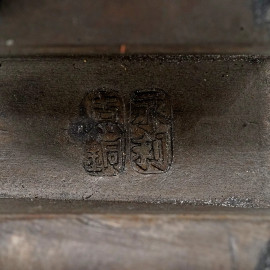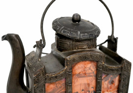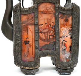 Teiera in metallo brunito con superficie decorata con inserti in vetro dipinti con scene di vita quotidiana, cm 16x14x5,5. Cina, XX secolo, (difetti)