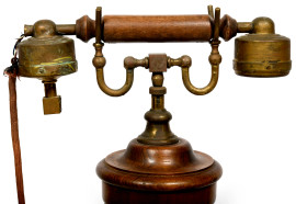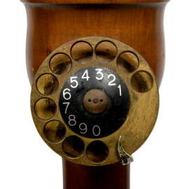 Disco combinatore rotante. L'autircolare in legno e ottone si collega a un ricevitore a cornetta.