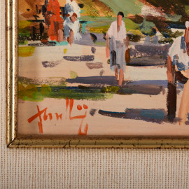 Un pomeriggio assolato al parco, acrilico su tavoletta, XX secolo, cm 11x29 entro cornice, firmato in basso a sinistra