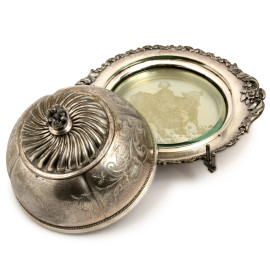 Vaso e burriera in metallo argentato lavorato a cesello e sbalzo, rispettivamente altezza cm 33 e 13x18x16,5, XX secolo, (difetti)