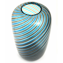 Vaso in vetro di Murano ovoidale con decoro spiraliforme nei toni del blu e del grigio, firmato e datato a graffio sotto la base "Venini 91", altezza cm 37 (difetti)
