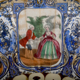 Ventaglio in carta dipinto con scene galanti con decorazioni nei toni del blu e oro XIX secolo, cm 25x47 entro cornice (baheca)