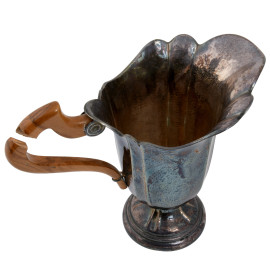 Versatoio in metallo argentato con manico in legno, cm 23x27x15, (difetti e rotture)