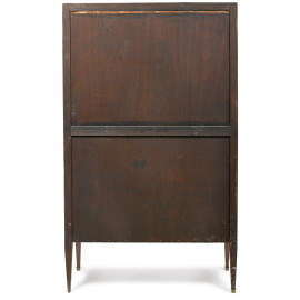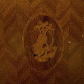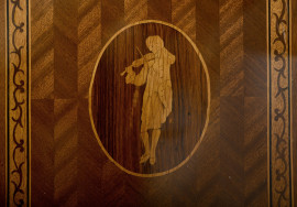 Sportelli con cornice intarsiata e pannelli inferiori decorati con medaglioni raffiguranti strumenti musicali. Gambe terminanti con scarpette in bronzo.