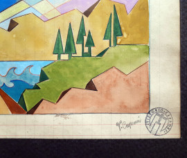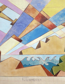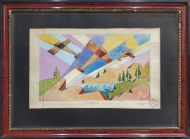 Vittorio Caproni (XX sec.) Aeropittura, tempera su carta, cm 22x35, titolato "Futuraerei" in basso al centro, firma e timbro dell'Artista in basso a destra, con cornice