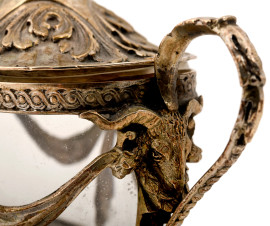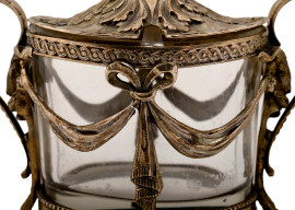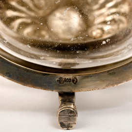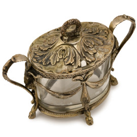Zuccheriera in argento e vetro cesellata a motivi vegetali e natri, biansata e poggiante su quattro piedini, cm 10x11,5x6,5, peso lordo gr. 200