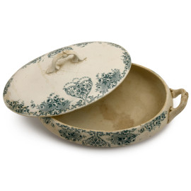 Zuppiera con coperchio in maiolica a fondo bianco con decori floreali nei toni del turchese, XX secolo, cm 8x29x18 (difetti)