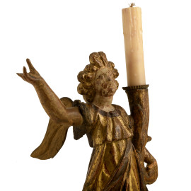 Angelo reggicero in legno intagliato e scolpito, XIX secolo, altezza cm 58, (difetti)