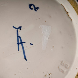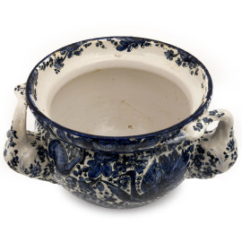 Cachepot in ceramica a fondo bianco con decorazione a volatili e motivi vegetali nei toni del blu. Prese a guisa di gru in rilievo, cm 27x40, (difetti, cadute di smalto stannifero, difetti di cottura)