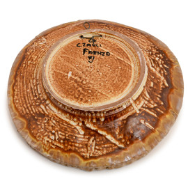 Carlo Zauli (Faenza 1926 – 2002), Piatto in ceramica con decorazione centrale su sfondo giallo e cinque ovali alla tesa con figure stilizzate. Firmato al fondo, diametro cm 44, (difetti)