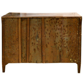 Cassettone Luigi XVI in legno intarsiato in varie essenze con fronte scandito da tre cassetti in colonna, XIX secolo, cm 93x122x61,5, (difetti)