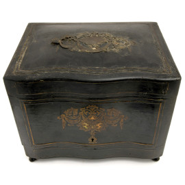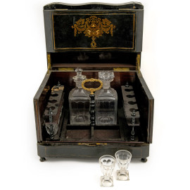 Cave liquor in legno laccato nero e stemma dipinto oro sul fronte e in lamina di metallo nella parte superiore. Vano interno contenente 2 bottiglie e 8 bicchierini da liquore in vetro, XX secolo, cm 26x32,4x24, (difetti, rotture, mancanze)