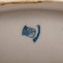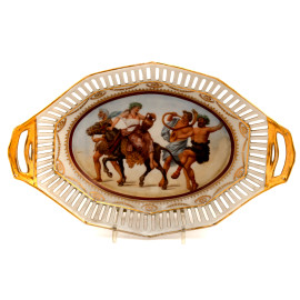 Centrino in porcellana Schumann con orlo traforato e al cavetto scena di baccanale,XX secolo, cm 7x30,5x19,5, (difetti)