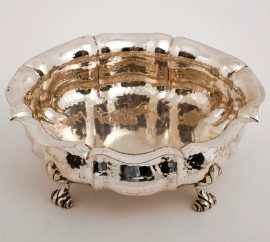 Centrotavola in argento con profilo mosso poggiante su quattro piedini ferini, cm 10x22,5x26,5, peso gr 640