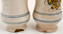 Coppia di albarelli in maiolica decorati con stemmi policromi, corpo cilindrico rastremato al centro e orlo estroflesso, XVIII secolo, altezza massima cm 21,5, (difetti)