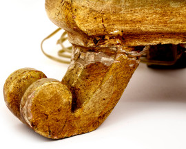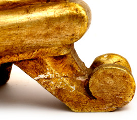 Coppia di candelieri montati a lampada in legno intagliato e dorato poggianti su tre piedi a ricciolo, XX secolo, altezza massima altezza cm 75, (difetti)
