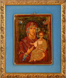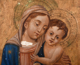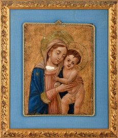 Coppia di icone raffguranti Madonna con Bambino, XX secolo, tempera su tavola, cm 37x28 e cm 36,5x27, entro cornice, (difetti)