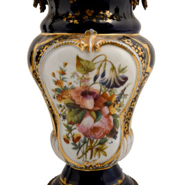 Coppia di lampade a olio elettrificate in porcellana blu con decori oro e figure di gentiluomo e gentildonna. Francia fine del XIX secolo, altezza cm 79, (difetti)