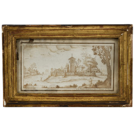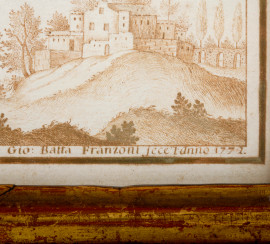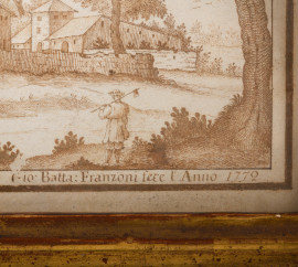 Coppia di paesaggi con figure, inchiostro su carta, cm 12x22, iscritti "Gio. Battista Franzoni fece l'Anno 1772", in basso a destra, entro cornice, (difetti)