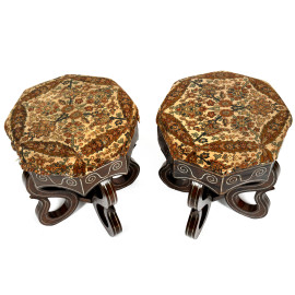 Coppia di pouff poggiapiedi dal profilo ottagonale in legno impiallacciato con sedute in tessuro ricamato a motivi floreali, poggianti su quattro gambe ad S raccordate, XX secolo, cm 45x38, (difetti)