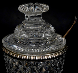 Coppia di salierine in cristallo con profilo in argento e cucchiaino in argento inglese, altezza cm 14, (difetti)