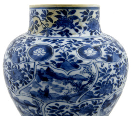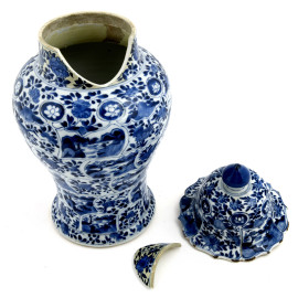 Coppia di vasi cinesi con coperchio in ceramica decorata con scene floreali e di paesaggio nei toni del bianco e del blu, Cina XX secolo, altezza cm 38 (difetti, rotture)