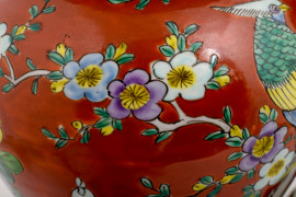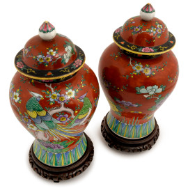 Coppia di vasi con coperchio in ceramica policroma decorata a motivi floreali, basi in tek, Cina, XX secolo, altezza cm 33, (difetti)