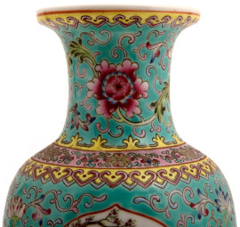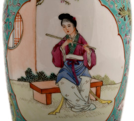 Coppia di vasi giapponesi in ceramica ornata in policromia con figure di geisha e motivi vegetali e astratti, XX secolo, altezza cm 21, (difetti)