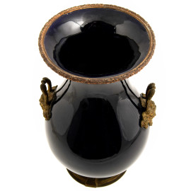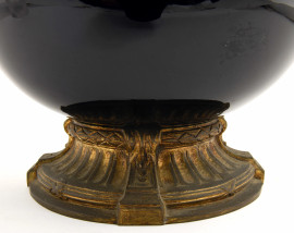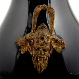 Coppia di vasi in vetro blu con orlo, base e prese a foggia di teste di sileno in bronzo dorato, inizio XX secolo, altezza cm 32,5, (difetti)