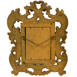 Cornice in legno dorato e intagliato a volute fogliacee, XVIII secolo, ingombro cm 55x44, battente cm 23x18,5, (difetti)