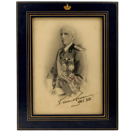 Fotografia su carta Agfa Brovira raffgurante Vittorio Emanuele III, in basso a destra firmata ad inchiostro "Vittorio Emanuele 1941 XIX", cm 35,5x26, (difetti)