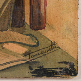 Gesù tra i dottori, acquerello su carta applicata su masonite, cm 25x27, entro cornice, firmato in basso a destra, XX secolo, (difetti)