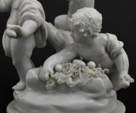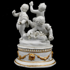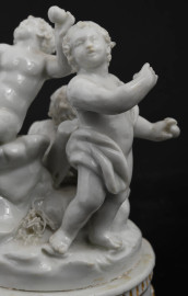 Gioco di putti,in porcellana, XVIII secolo, base circolare decorata con festoni dorati a rilievo, cm 14x11, (difetti)
