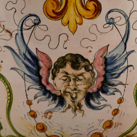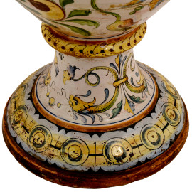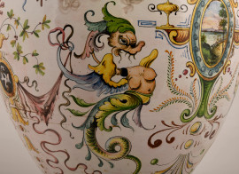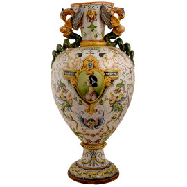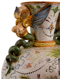 Grande vaso in ceramica a doppia presa a guisa di animale mitologico, dipinta a fondo bianco con decori roccailles e motivi neorinascimentali, altezza cm 72, (difetti)
