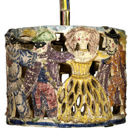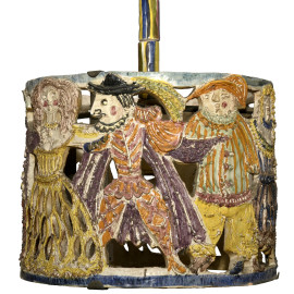 Lampada a sospensione realizzata con fusto e diffusore in ceramica di Vietri, altezza complessiva cm 117; diametro diffusore cm 39,5, (difetti)