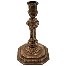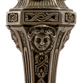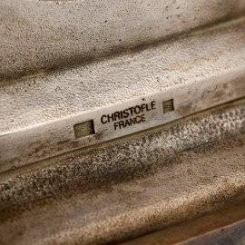 Lampada Christofle con decoro cesellato a mascheroni e grottesce con base ottagonale e paralume in stoffa bianca, altezza complessiva cm 39, (difetti)