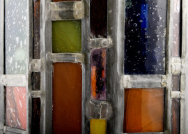 Lampada in metallo argentato, con base circolare e paralume cilindrico in metallo argentato e inserti rettangolari in vetro di vari colori e dimensioni, XX secolo, altezza cm 73, (difetti)