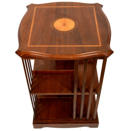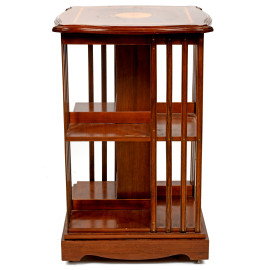 Libreria girevole in legno di mogano con piano ad intarsio centrale e profilo mosso. XX secolo, cm 81x50x50, (difetti)