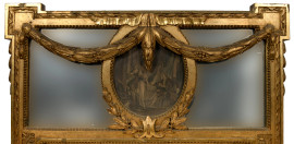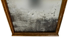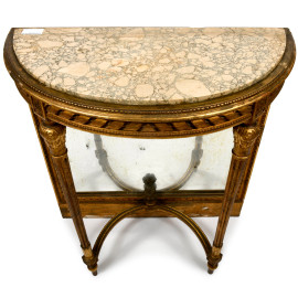 Lotto composto da: Consolle in legno dorato e intagliato con piano in marmo poggiante su due gambe anteriori tornite in legno raccordate ad un pannello a specchio con cornice in legno intagliato e dorato, inizi del XX secolo, cm 91x82x40, (difetti)