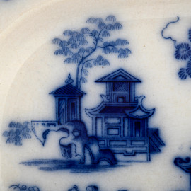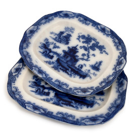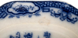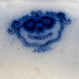 Lotto composto da due grandi vassoi rettangolari in ceramica Tonquin a fondo bianco con decori di ispirazione orientale, cm