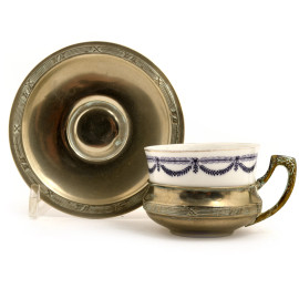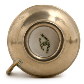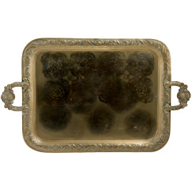 Lotto composto da grande vassoio in metallo argentato finemente cesellato ai bordi a doppia presa, cinque tazzine bavaria con portatazzina in metallo argentato e sei piattini in metallo argentato, misure vassoio cm 57x36, (difetti)