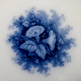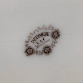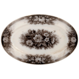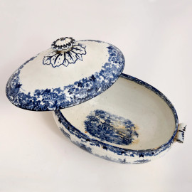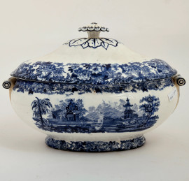 Lotto composto da una zuppiera a cineseria, vassoio ovale e due piatti da portata circolare con decori nei toni del grigio e del blu, XX secolo, altezza zuppiera cm 23; vassoio cm 411,5; diametro piatti cm 37,5, (difetti)