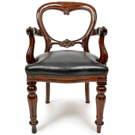 Lotto di 10 poltroncine in mogano con seduta e braccioli in pelle nera, XX secolo, cm 92x55x55, (difetti)