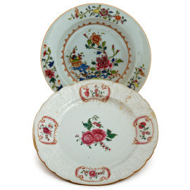 Lotto di 14 piatti di varia foggia in porcellana decorata in policromia a motivi vegetali e paesaggistici, misura massima diametro cm 23 Cina, XX secolo, (difetti)