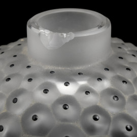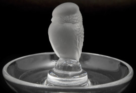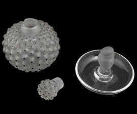 1) Bottiglietta da profumo Cactus Lalique, firmata a graffio al fondo, altezza cm 9, (difetti); 2) Piattino con presa a volatile in vetro Lalique, firmata a graffio al fondo, diametro cm 5,5, (difetti)