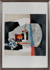 Lotto di due litografie: Orfeo Tamburi, cm 70x50, entro cornice, P.A., (difetti); Giancarlo Isola, cm 70x50, entro cornice, 9/80, (difetti)