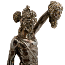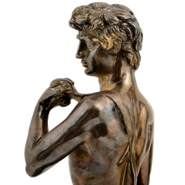 Lotto di due sculture in resina argentata riproduzioni del David e di Perseo con la testa di medusa, misure massime cm 31x9x10, (difetti)