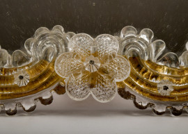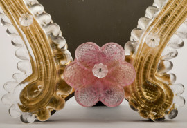 Lotto di due specchierine in vetro di Murano a profilo mosso con applicazioni in vetro di ispirazione floreale, XX secolo, misura massima cm 25,5x25,5