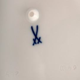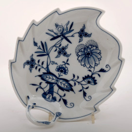 Lotto di tre vassoi a foggia di foglia in porcellana Meissen a fondo bianco con decori blu, misure massime cm 27x19, (difetti)